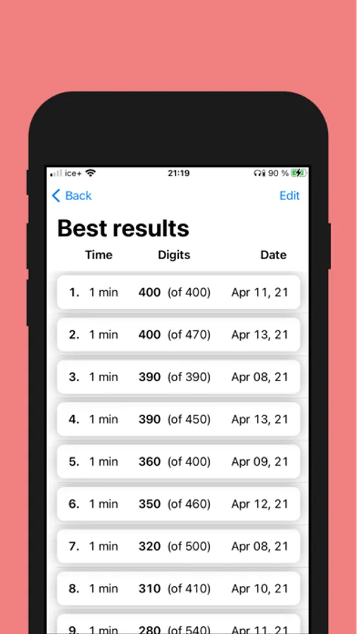 You can choose time to memorize, digits and grouping of the digits. Your best results can be saved.