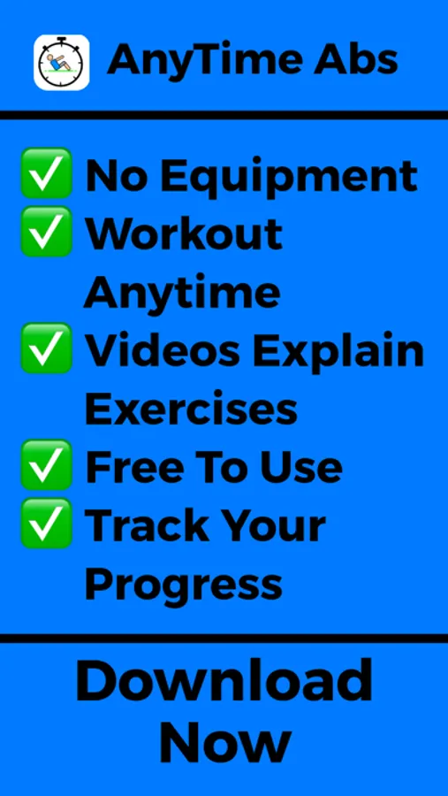 We made AnyTime Abs Workout because we got frustrated with how complicated workout apps are. With AnyTime Abs Workout, you do not need to answer any questions about your weight, fitness level, diet, fitness goals, equipment available, etc.