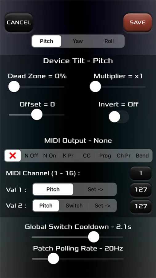 * Choose any or all axes of tilt, touch, and acceleration to control any MIDI parameters… it’s like having 8 expression pedals at once… and 8 feet to use them too!