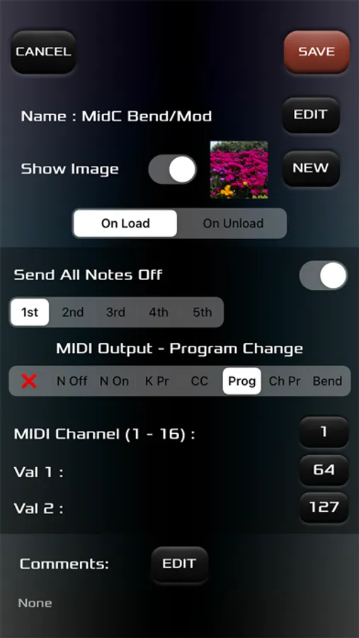 * Customisable background image for each patch - lyrics, chord cheat sheets, or just a cool picture. If it’s a picture in your camera roll, you can set it as the background.