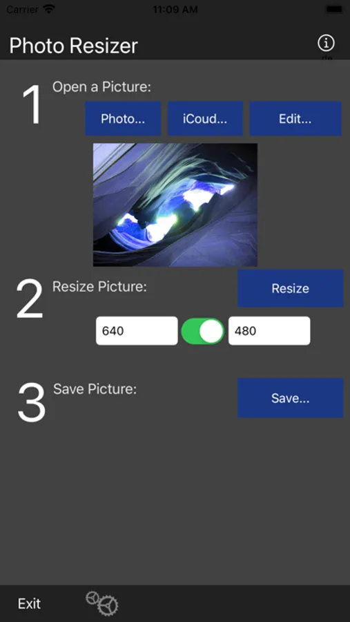 With this app, you can resize images in 3 easy steps. Open the photo (from the photo album or iCloud), enter the size, save. A copy of the image is saved. With the size, you can determine whether the image should be changed proportionally or whether you want to specify the width and height individually. In addition, a simple editing tool is integrated with which you can set brightness, contrast and saturation.