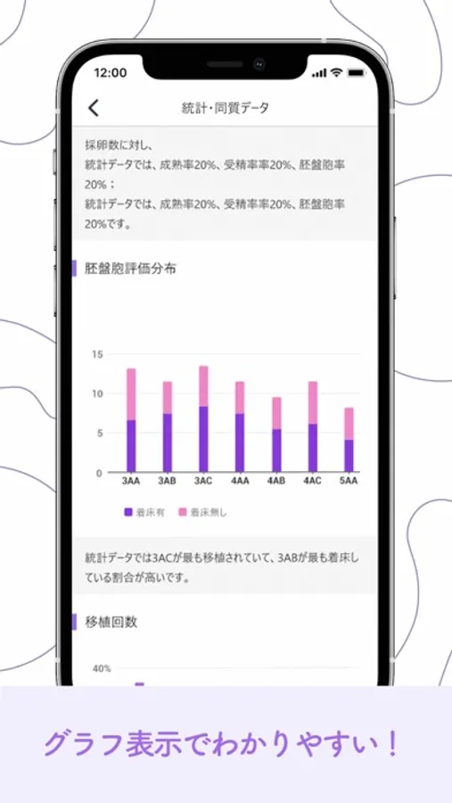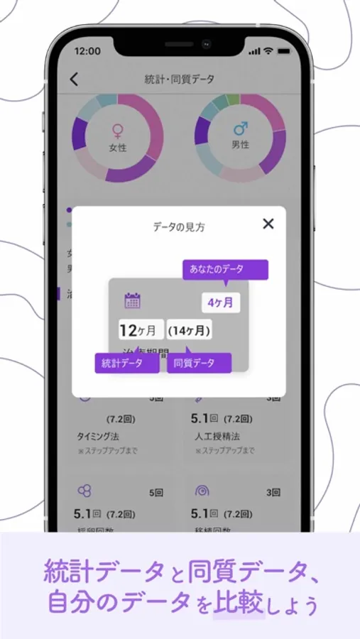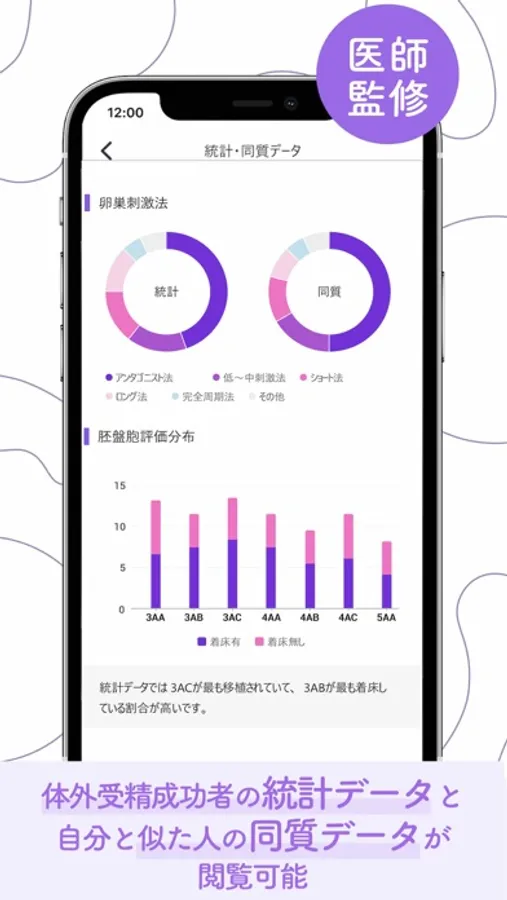年齢、治療費、治療期間、卵巣刺激法や採卵、移植の回数、胚盤胞評価分布、女性疾患や男性疾患の陽性率などの不妊治療に関する治療データが閲覧可能。