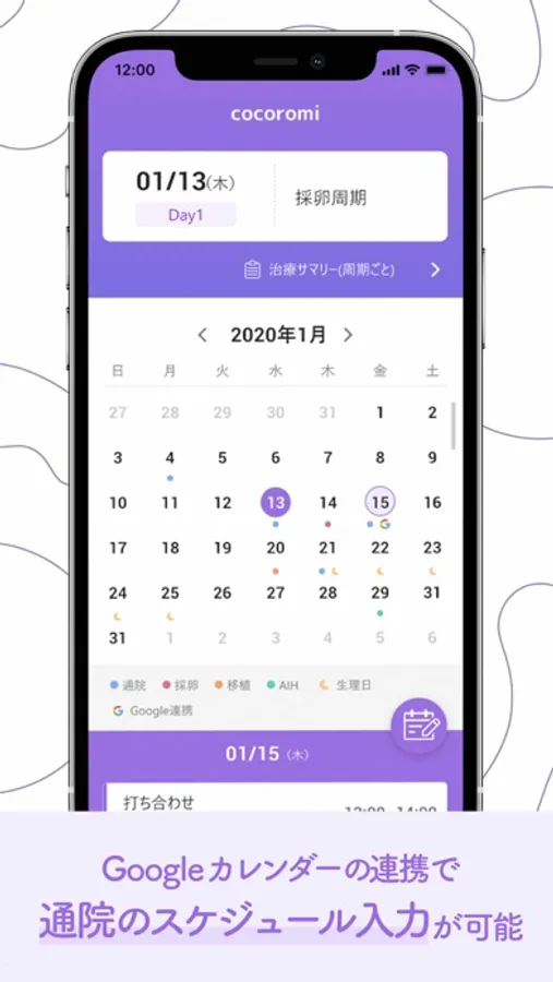 通院のスケジュールの入力や、通院日の診療内容を細かく記録する事ができる治療ログ機能(googleカレンダー連携可能)。