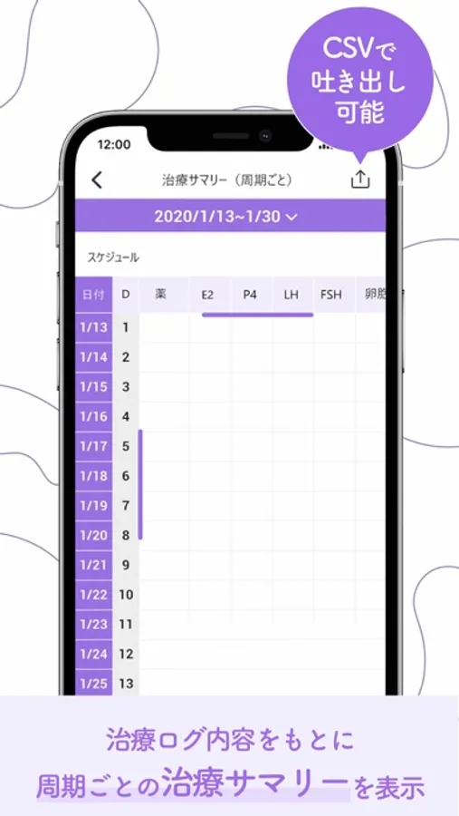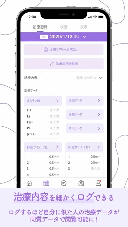 入力した治療内容について、周期ごとに薬の種類やモルモン値の変化、採卵や移植データをまとめた治療サマリを表示。