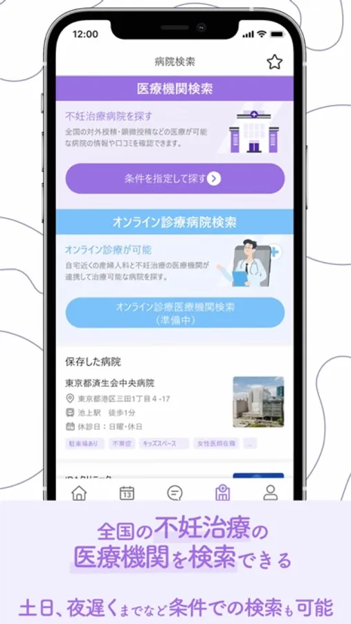お近くの不妊治療が可能な医療機関をお探しいただけます。様々な条件指定も可能で、あなたにあった医療機関を探してみましょう。」