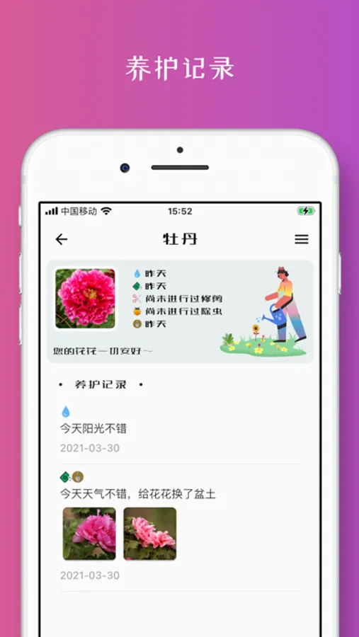通过花管家,您可以记录爱花的成长,建立养护档案,免除忘记对爱花进行浇水、施肥、除虫等平日养护操作,是养花新人的实用小工具。