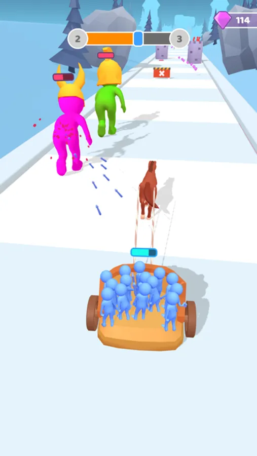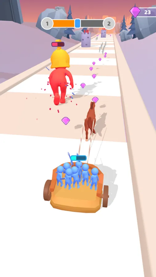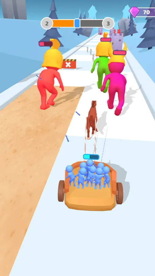 Get ready to defeat giants and save your people! Collect all the people to your chariot and add them to your army. Do not let giants reach into your castle. Try not to bump into blocks. You should be careful to not break chariot rope!