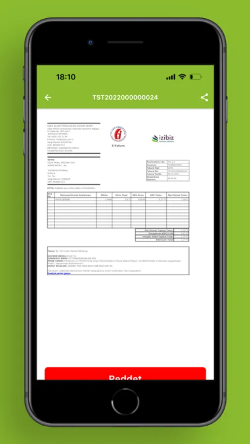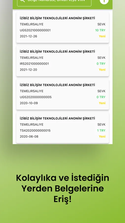 İZİBİZ mobil uygulaması ile e-belgelerinizi KOLAY ve HIZLI bir şekilde yönetebilirsiniz. Gelen ticari e-Faturalara KABUL veya RET cevabı verebilir, gelen e-İrsaliyeleri yanıtlayabilirsiniz. İZİBİZ mobil uygulamasının KOLAY ve PRATİK ara yüzünden birkaç dokunuş ile e-belgelerinizi PDF formatında görüntüleyebilir, telefonunuza indirebilir ve paylaşabilirsiniz. Temel bir takım filtreleme ve arama opsiyonları ile aradığınız e-belgelerinize hızlıca ulaşabilirsiniz.
