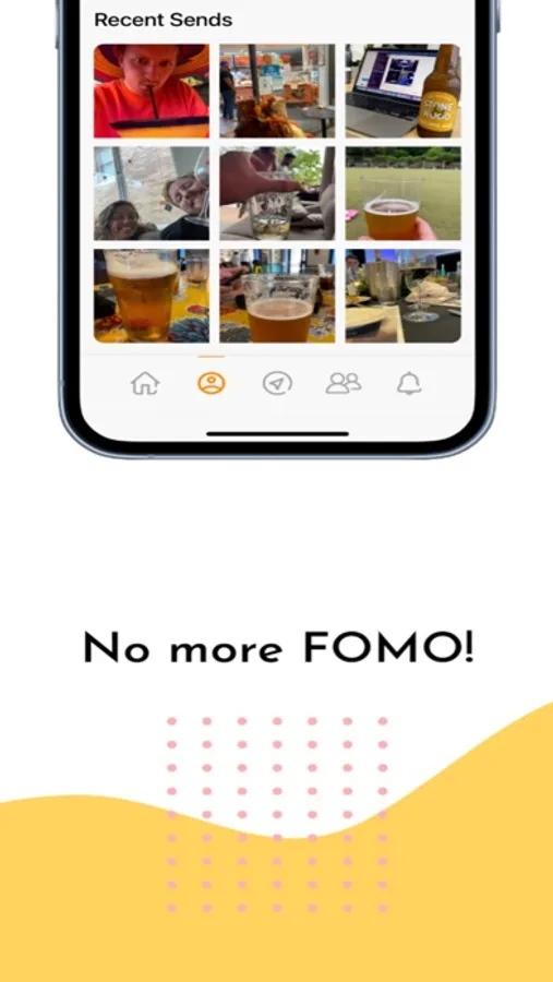PROFILE - Everyone has their own profile with their number of SENDs, favourite drink and location as well as a photo grid of all their pictures.