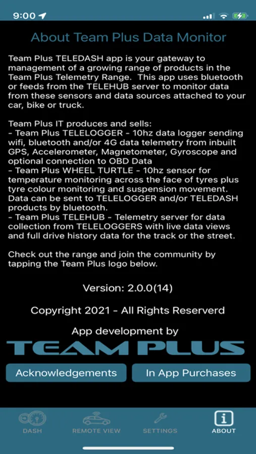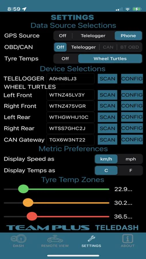 Team Plus TELEDASH provides real time visualisation, Record and Playback, Data Export, and LIVE SHARING of data from our famous Wheel Turtle tyre temperature sensors PLUS phone GPS and motion data and a growing range of products in the Team Plus Telemetry range. This app uses bluetooth to monitor data from these sensors and data sources attached to your car, bike or truck.