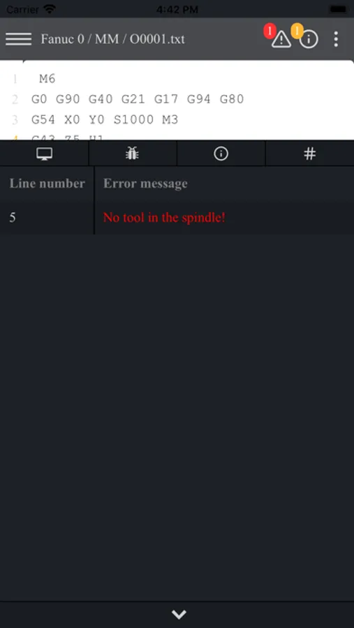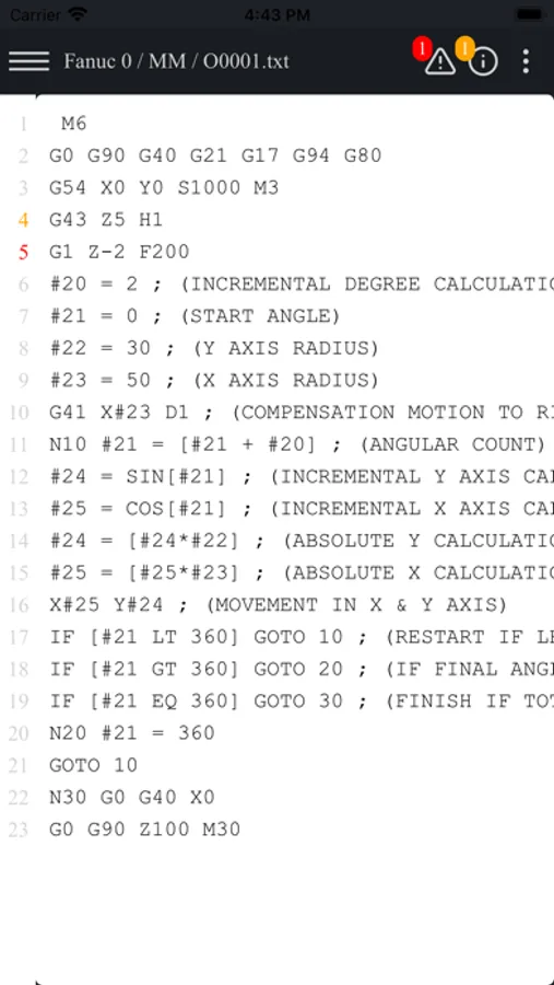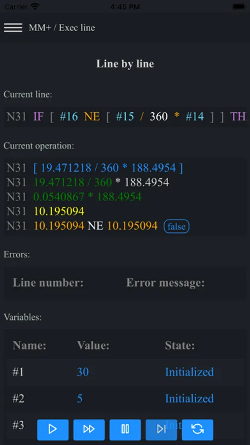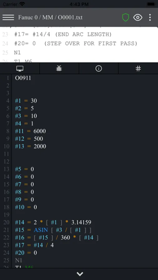 The core of Macro Mill Plus CNC is especially designed for this purpose interpreter with a built-in debugging process tool to execute and analyze CNC macros (Fanuc Custom Macro B). You should know that Macro Mill Plus CNC, Macro Terminal CNC and Macro Lathe CNC is the only CNC software in the world that shows all math and logic operations one by one, line by line (known as parse tree).