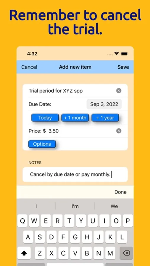 If you've ever let a subscription lapse, missed a bill payment, or ended up paying for a product after the trial period was over, just because you weren't paying attention to the due date, you'll appreciate this app. You can also keep track of tasks, especially those that you keep putting off. The app will tell you how long it's been since you were supposed to do it (without nagging you).