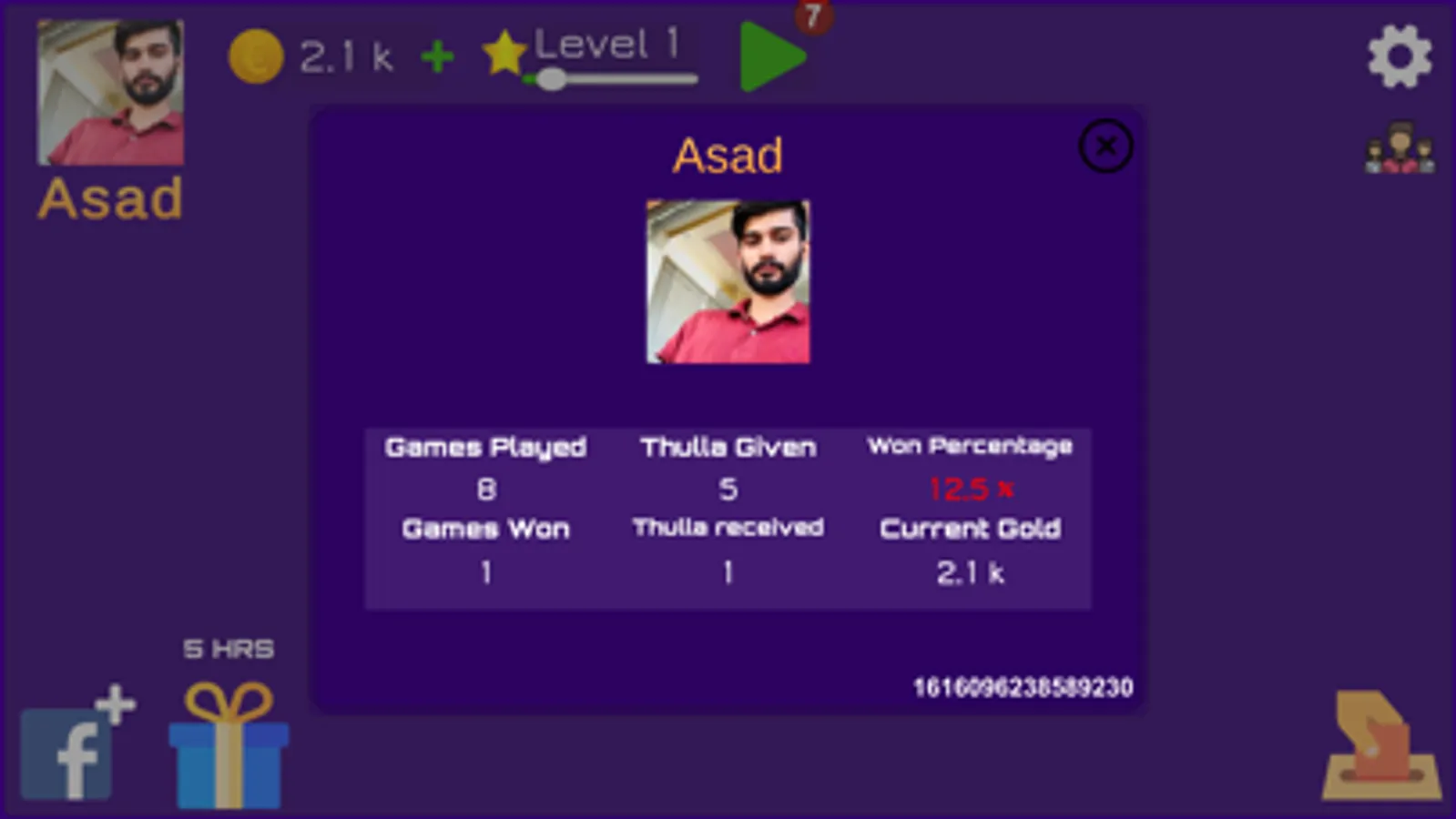 Game play is simple, get rid of all the cards, if other person don't have the same suit card then you will take his cards, if you don't have same suit the other person throw a card and on your turn you can get rid of any of the bigger card. Other thing is I am keeping some stats of games as well, like how many games played, games won, Thulla given, Thulla received, won percentage etc