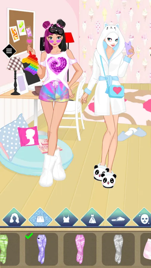 The last and most exciting stage in the game is the pajama party. After school, the adorable thing to do is to go to a friend for a sleepover. You can pick up comfortable cute slippers - pandas or slippers - bunnies, cute tops, shorts, make each other's hairstyles, try on various kigurumi, and make a face mask.