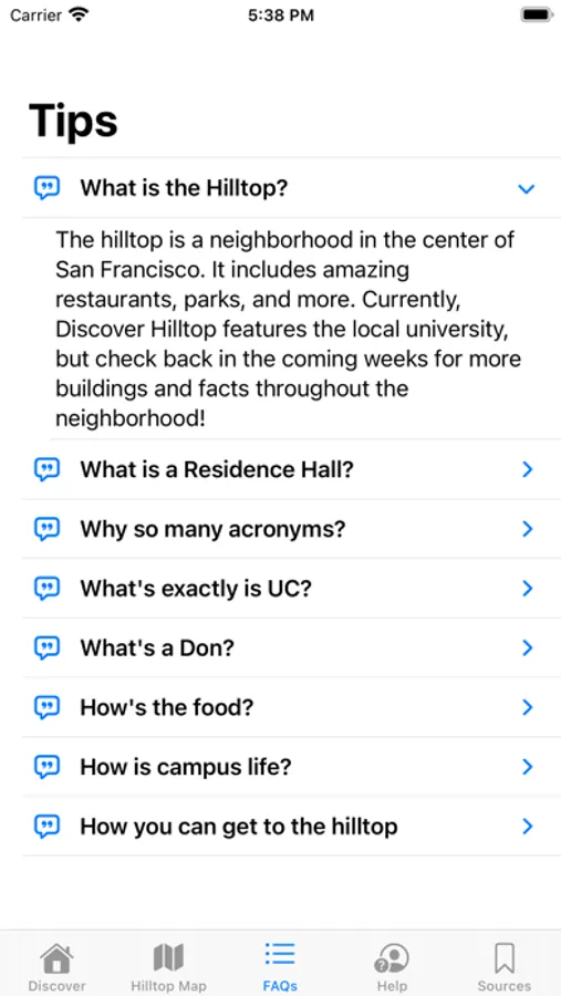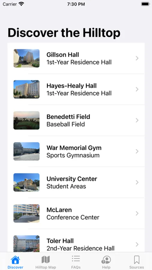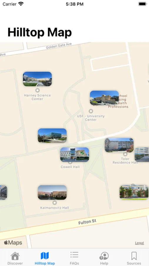 Discover Hilltop is an interactive way to learn the layout of the SF hilltop neighborhood and surrounding college campus as well as historical and modern facts about its buildings. The hilltop is at the geographical center of San Francisco, and each of its buildings tells a unique story. This app's purpose it to allow you to read those stories while gaining a greater understanding of the hilltop as a whole--even without physically visiting.