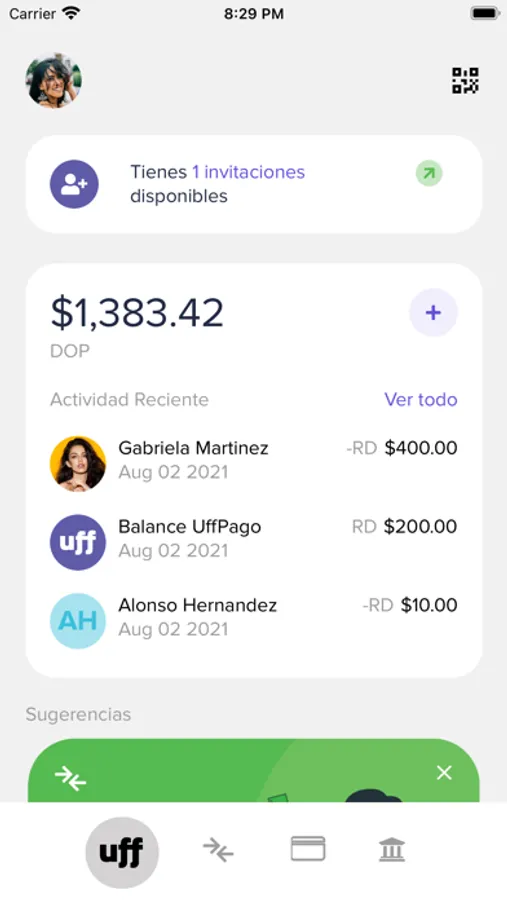 Con UffPago paga y recibe fondos de otros usuarios a través de nuestra simple interfaz. Administra tu tarjeta de débito de forma fácil y segura desde la comodidad de tu móvil. Todos los usuarios mayores de edad son bienvenidos en la plataforma y abrir una cuenta solo toma 5min desde la comodidad de tu teléfono. Y si necesitas colocar en tus fondos en una cuenta bancaria tradicional, no hay problema, UffPago les ofrece a sus usuarios la posibilidad de que transfieran sus fondos a sus cuentas en otras instituciones financieras dentro de República Dominicana.