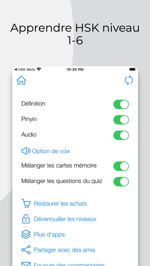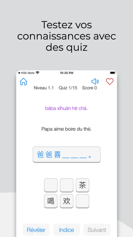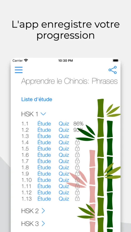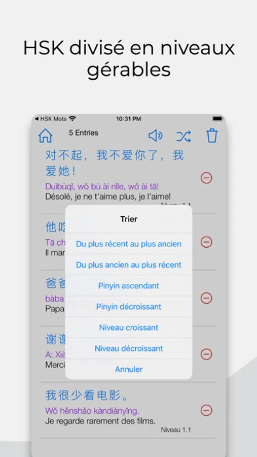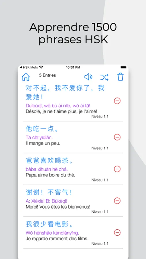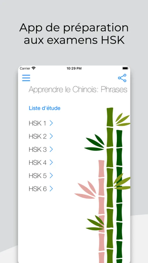 App de préparation aux examens HSK. Meilleure app HSK pour apprendre et maîtriser les 1500 phrases d'examen HSK chinois. Basé sur les niveaux HSK 1-6. Répondez à des quiz pour tester vos connaissances. Parcourez les cartes mémoire pour reconnaître et renforcer rapidement la mémoire grâce au rappel et à la répétition. L'app suivra automatiquement votre progression. L'app enregistre et affiche les résultats de votre quiz pour fournir des commentaires d'amélioration. App compagnon pour Apprendre le Chinois: Mots HSK (français). Partie 2 de la série Apprendre le Chinois (français French).