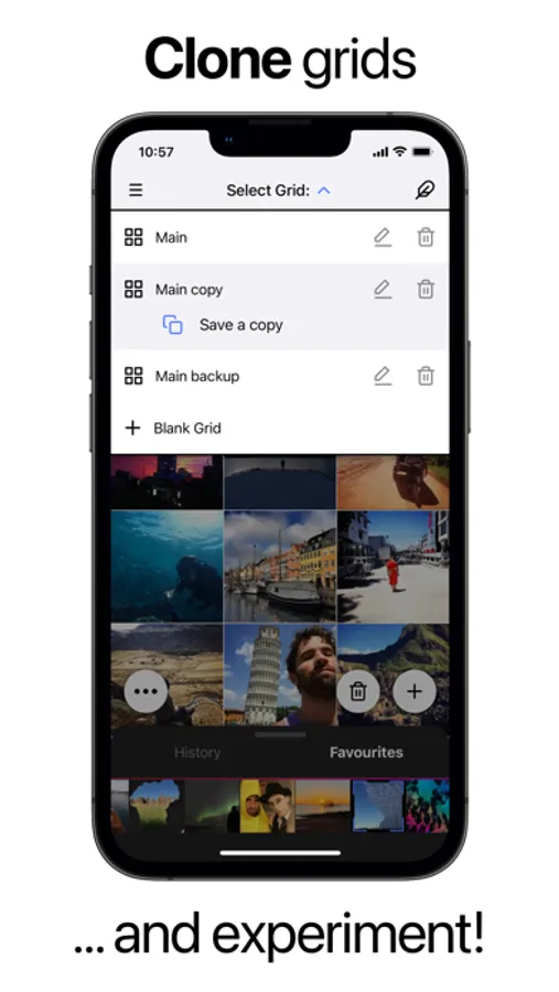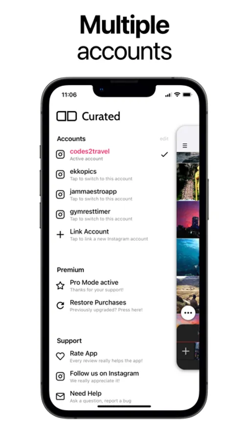 Have as many accounts with their own history/favourites, connected instagram account, and set of grids as you like.