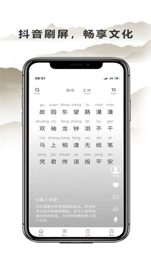 我们的应用不仅有诗词欣赏功能,还结合了抖音的刷屏功能。你可以在这里欣赏到古人的才情和智慧,也可以通过刷屏功能获取最新的诗词动态和热门内容。同时,还可以通过分享和点赞来与朋友们分享你的阅读心得和文化乐趣。在使用抖音的过程中,你可以随时切换到我们的古诗应用,感受诗词的韵味和抖音的乐趣。无论是欣赏诗词还是刷抖音,都能让你轻松愉悦地度过美好时光。