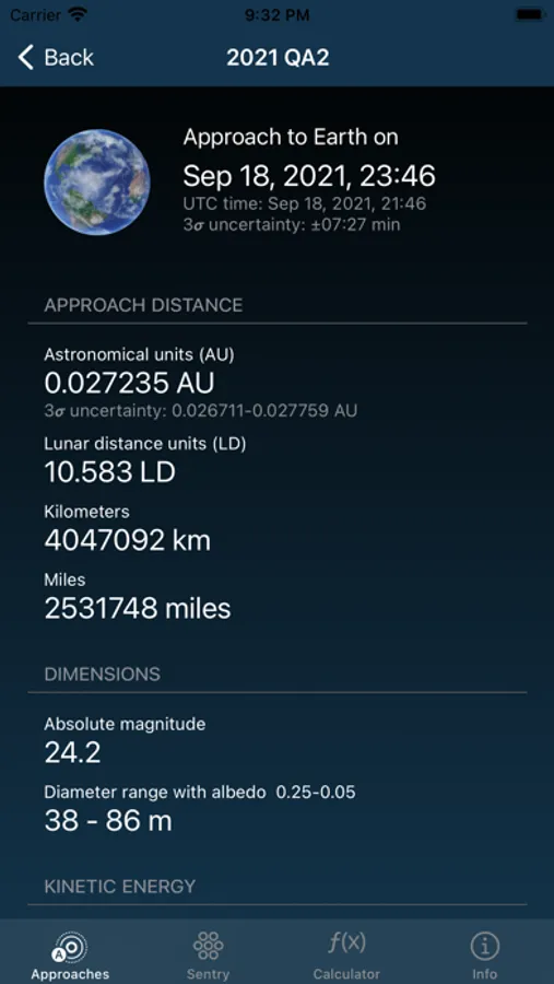 Check out the next asteroid's close approach to Earth, the moon, and the solar system's other planets. Examine the date and hour, the distance, velocity, and magnitude, and the estimated maximum energy in kilotons that an impact could deliver. Browse the Sentry database, a highly automated collision monitoring system that continually scans the most current asteroid catalog for possibilities of future impact with Earth over the next 100 years. Calculate the mass and energy of an asteroid from the absolute magnitude and approaching speed.