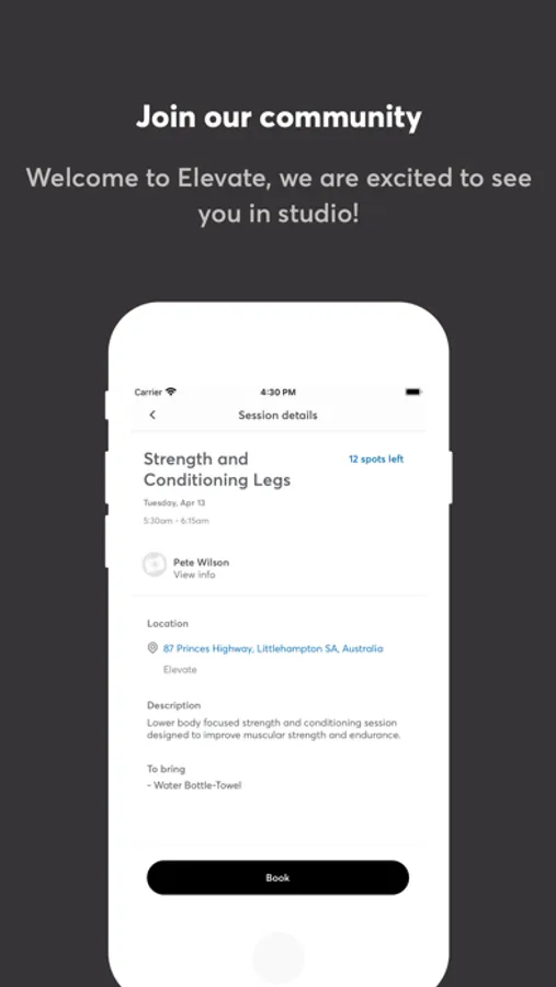 Sign up or login to the Elevate Fitness + Movement mobile app to: