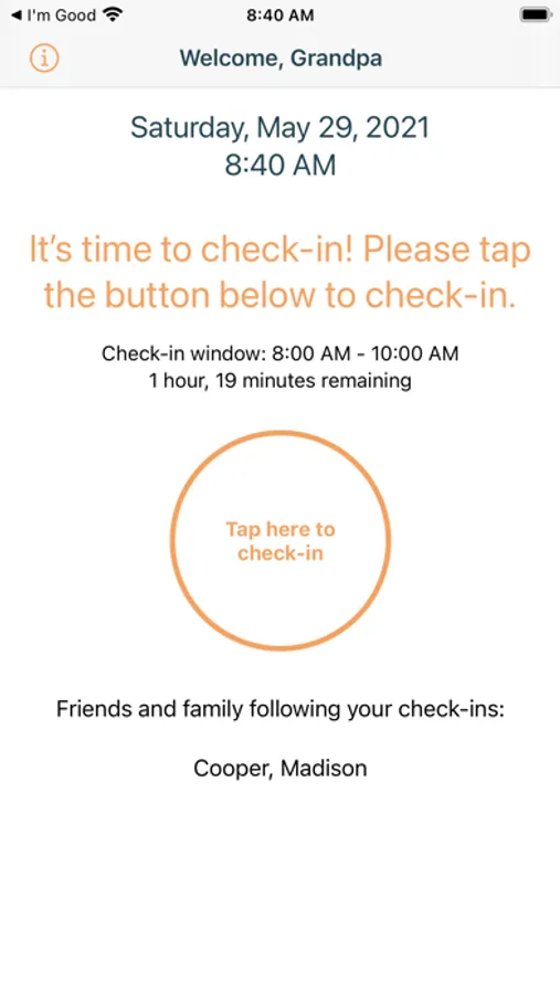 A friend or family member will download our companion App called I'm Good-F&F and send a VIP an invitation to download I'm Good-VIP. Once I'm Good-VIP is installed, the VIP will use a simple interface to check-in daily according to a configurable schedule. The VIP will be reminded to check-in halfway through their check-in window, while friends and family members will receive a notification if any VIP misses a check-in.