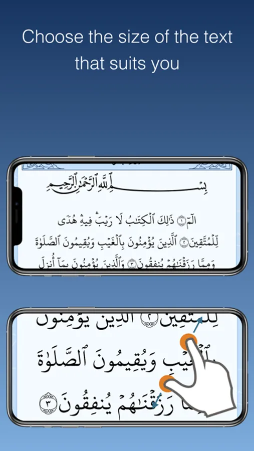 تستطيع في التطبيق التحكم بحجم الخط، وطريقة التفاعل، سواء التمرير المستمر أو الانتقال اليدوي. كذلك استعراض الآيات بالشكل الطولي أو العرضي.