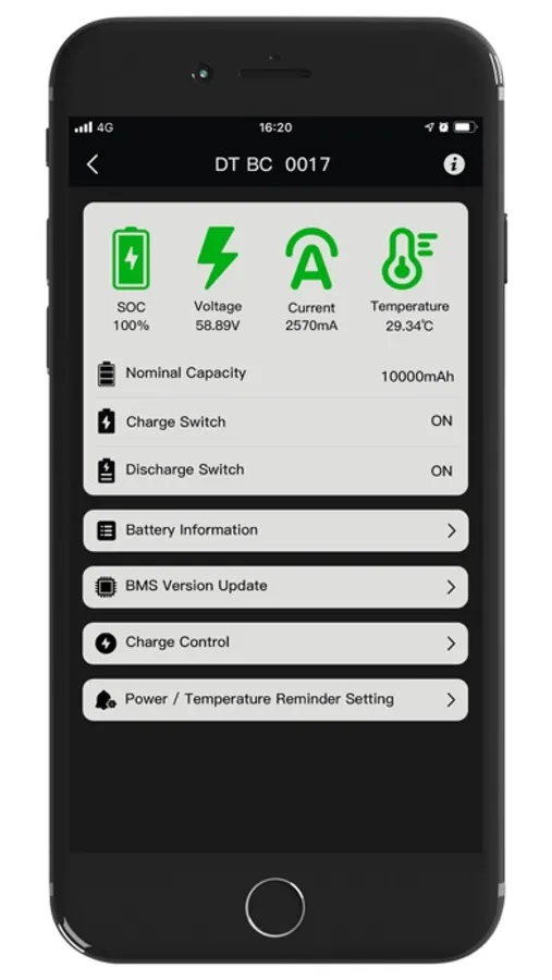 The smart battery pack has a built-in remote bluetooth module, which connects to the mobile phone via bluetooth to the app, and the app can read the following information: