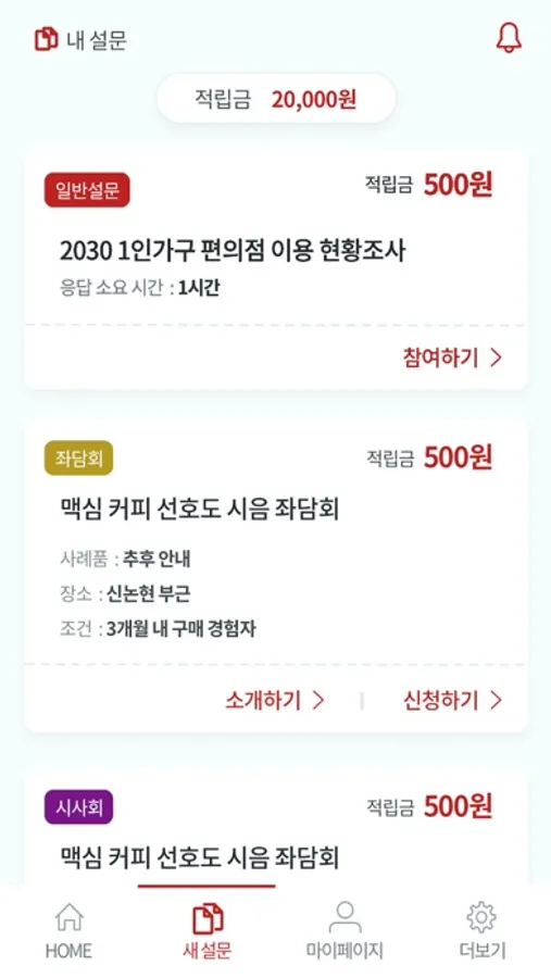 조사 참여 1회 당 500~3,000원 적립금을 지급합니다.