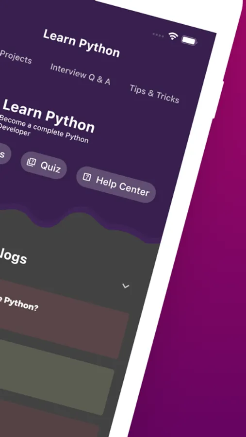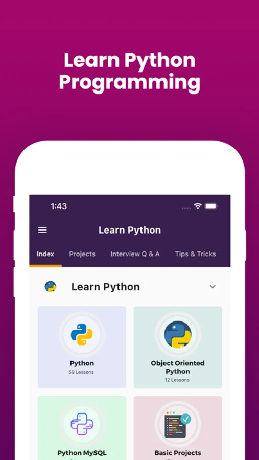 Our learn python programming app provides the best study materials for all the beginner and Expert level programmers who want to learn the python programming language and want to build strong fundamentals to crack any job interview in this language.