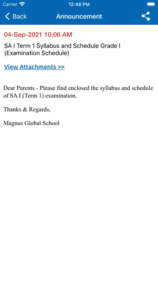 Magnus Global School Provides communication app for parents using which they can download school announcements,class assignments, can see attendance and activity.
