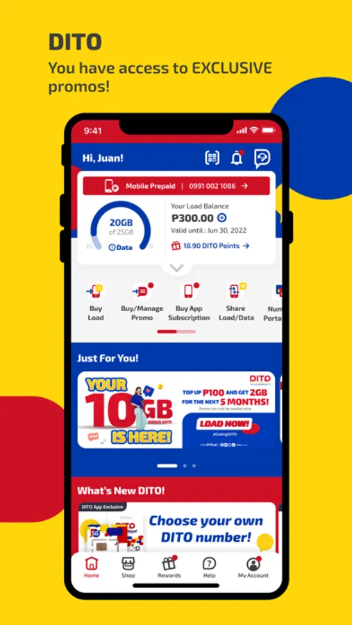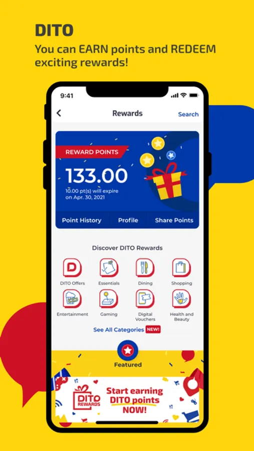 • Earn DITO points when you buy load, buy promos, or update your DITO Rewards profile.