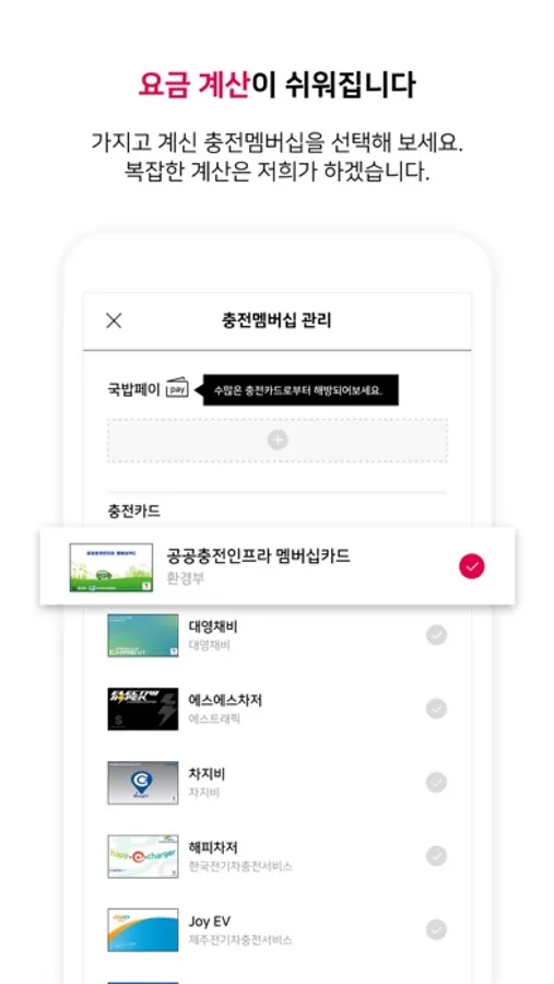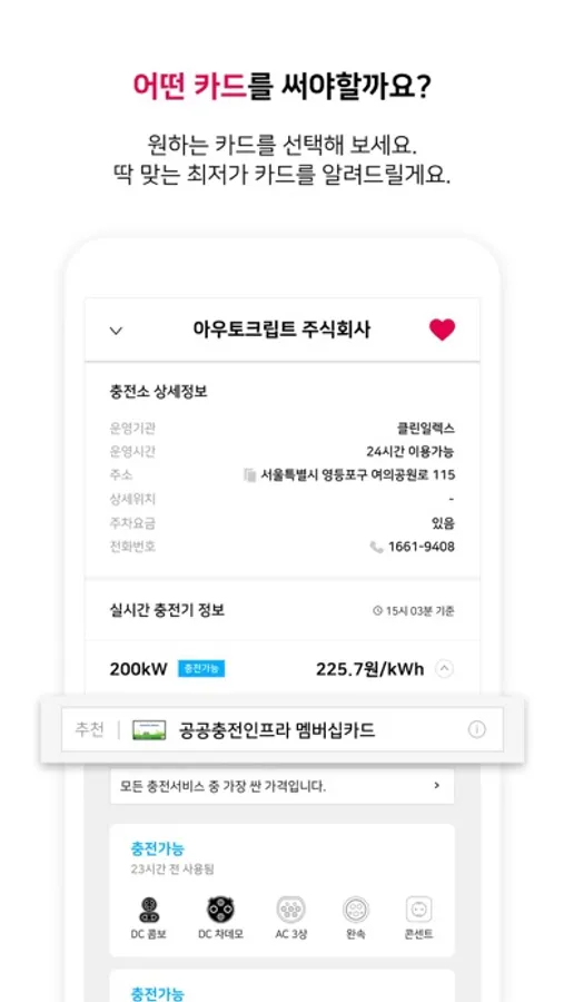 사용자가 보유 중인 다양한 충전카드 중 해당 충전소에서 최저가로 이용할 수 있는 정보를 제공합니다.