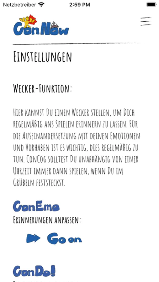 ConNow soll als Hilfsinstrument für Zuhause entweder Deine Therapie unterstützen oder Dir dabei helfen, im Alltag Deine inneren Vorgänge besser zu verstehen, sozusagen als Vorsorge für Deine Psyche.