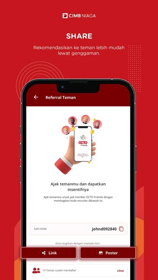 OCTO Friends is a referral application that provides cash rewards, where members can refer friends or family to get banking facilities from CIMB Niaga starting from mortgages, credit cards, personal loans, and savings.