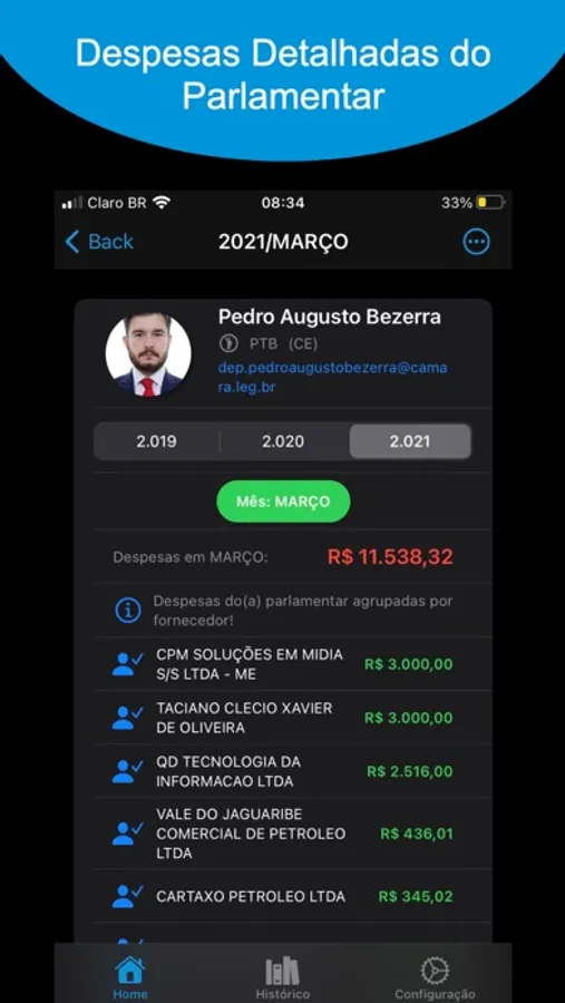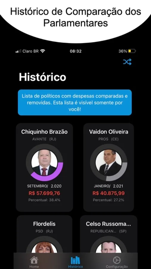 O aplicativo possui gráficos e agrupamentos (fornecedores e tipos de despesa) que serão fornecidos aos usuários, a fim de facilitar a comparação dos gastos entre os parlamentares. Esta comparação é feita mês a mês e pode ser configurada pelo próprio usuário, caso deseje. Ele fornece também ajustes para que o próprio usuário indique a quantidade de parlamentares que deseja comparar e se deseja armazenar um histórico de comparação entre eles no seu dispositivo. Para facilitar ainda mais a interação dos usuários com as informações de despesas dos parlamentares, o aplicativo fornece ajustes que podem ser feitos a qualquer momento. Os ajustes facilitam a filtragem dos parlamentares, como: sua unidade federativa (UF), seu partido de origem, legislatura atual e também qual tipo de ordenação deseja.
