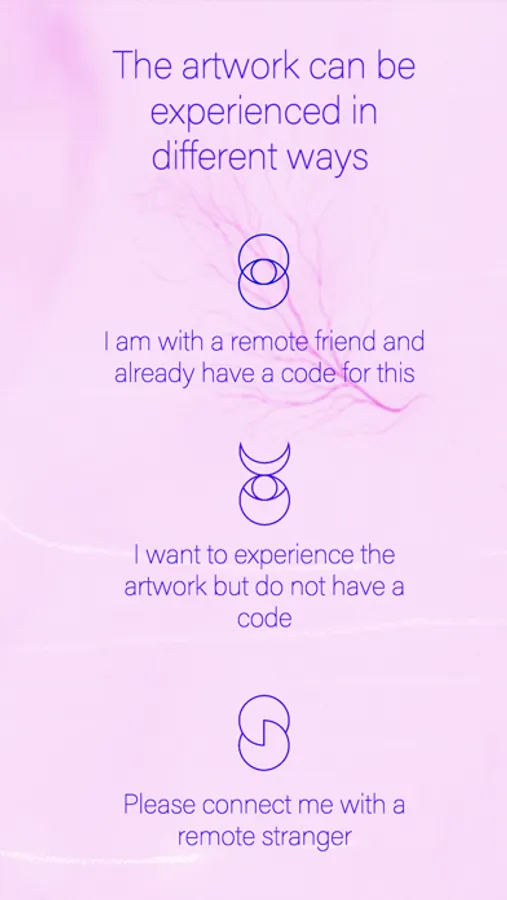 The artwork is accessible to enter 24/7. From a distance you can enter the piece at the same time as someone you know. The app will ask you to share a unique code between each other in order to connect and experience the artwork together.