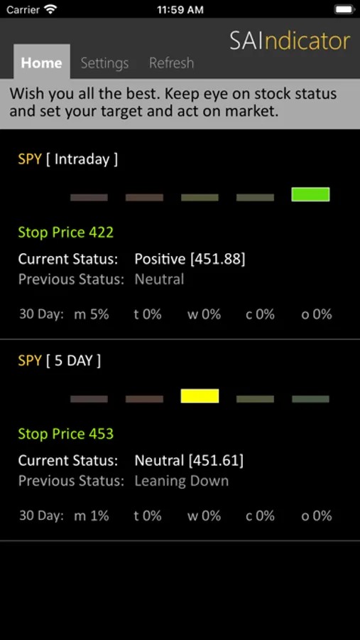 SAindicator is a client app for the SAindicator service to provide technical trend alerts on various publicly traded equities and the S&P500.