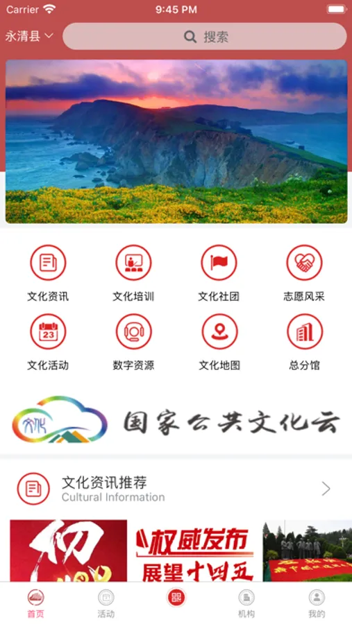 文化云-一款聚焦文化领域,提供公共文化生活服务和文化消费的文化互联网平台,展示张家口市永清县地区公共服务建设的一个公益性平台,展示了包括永清县的公共文化活动,各类文化场馆门户子平台,文化相关资讯,志愿活动和志愿者风采,网上数字资源等信息,包含市民互动,线上报名等交互性功能,包含大量的非遗资源,是天津市永清县公共文化服务领域的一张名片。