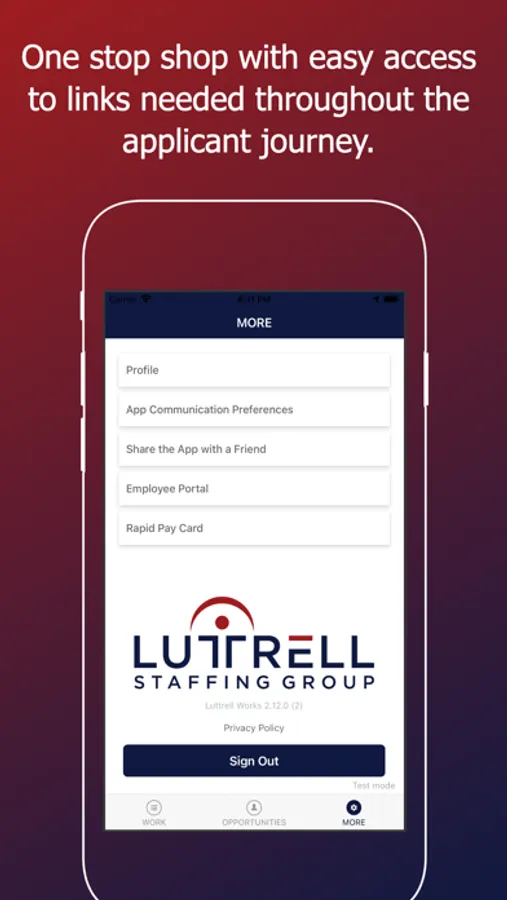 Luttrell Staffing Group applicants and associates can keep up with all the latest job-related information with the user-friendly and easy-to-navigate LuttrellWorks app. From searching job openings to in-app job acceptance to managing work schedules and reporting time, our app provides an easy way to manage all aspects of your position with us, right at your fingertips. Users can also receive instant job alerts, refer friends, obtain directions to their worksite, and more. Download the LuttrellWorks app today!