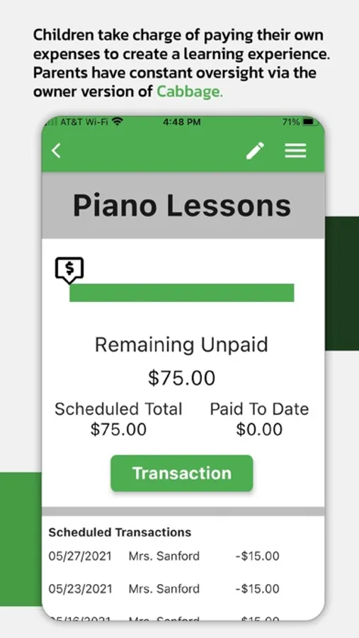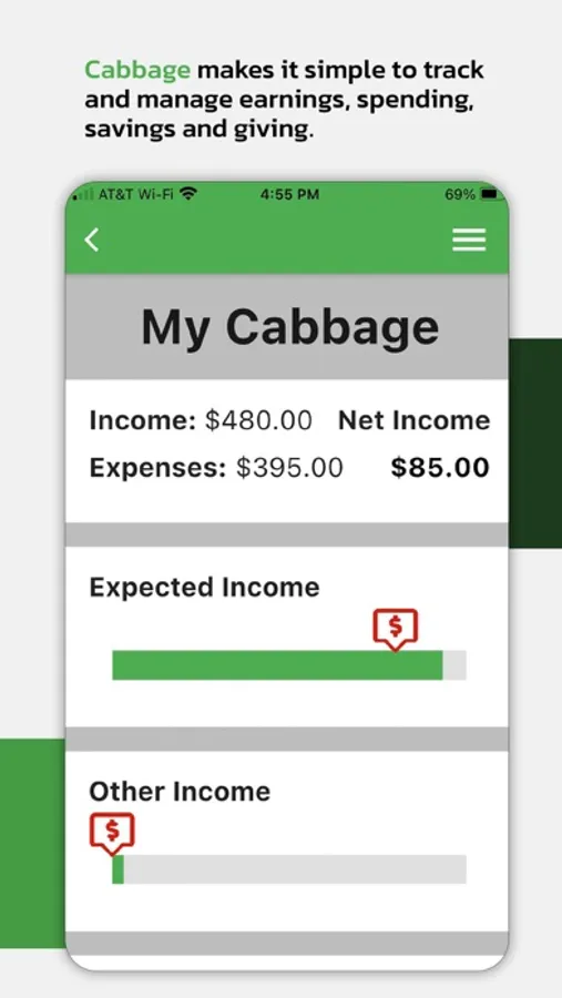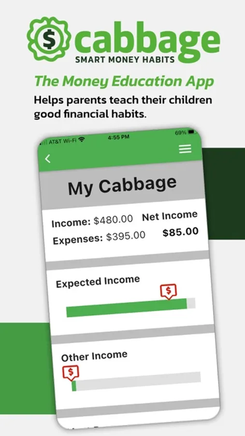 Cabbage is app to help parents teach children good financial practices in earning, saving, spending, and giving. Cabbage allows children to build and manage a plan for their income, savings, expenses, and charitable giving, while allowing parents oversight in a parent version of the app.