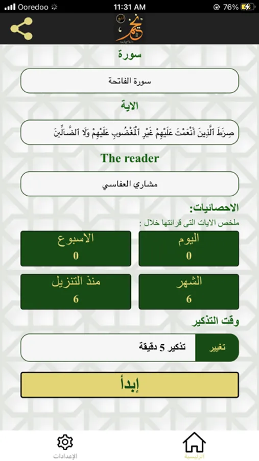 4. التطبيق سيظهر لك احصائيات قراءاتك اليومية والأسبوعية والشهرية منذ استخدامك للتطبيق .