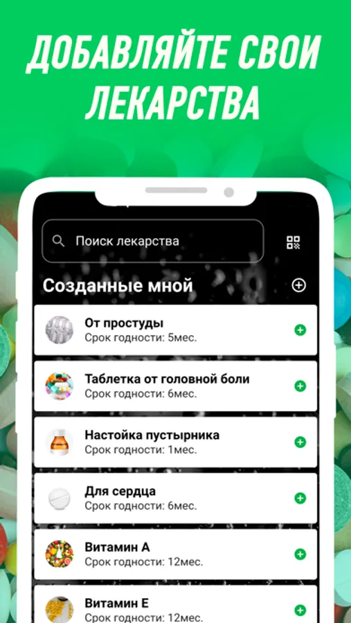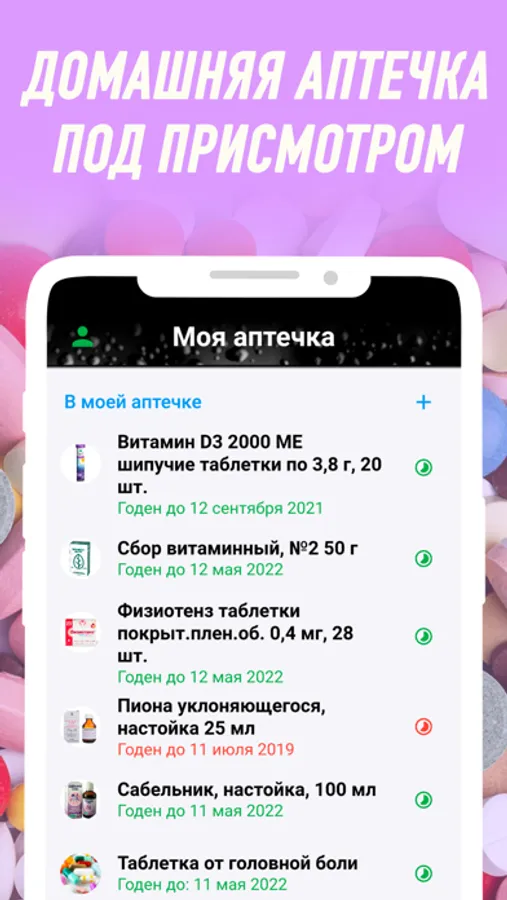 If the necessary medicine is not found in the app, you can create it yourself and add it to your first aid kit. By specifying the expiration date of the drug, you will receive a timely notification of its expiration and the need to update the contents of your first-aid kit.