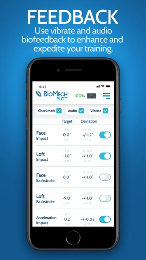 What’s so special about visual, audio and haptic feedback? BioMech uses these physiological mechanisms to expedite and enhance your practice experience and make the right motions more repeatable. The more senses you engage in real time, the faster and more likely you are to correct and improve your putting stroke and make that new pattern permanent. Plus, the audio and haptics provide a hands-free putting experience.