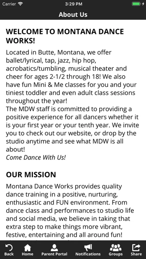 The Montana Dance Works app is an easy-to-use, on-the-go way to access everything Montana Dance Works has to offer right from your smartphone.