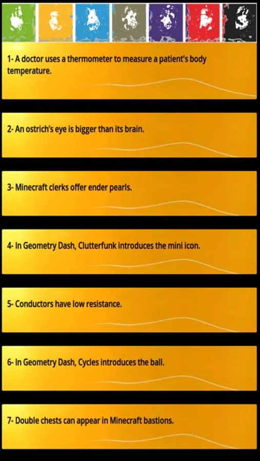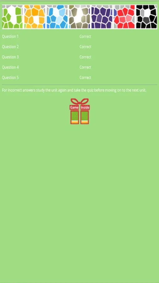The trivia section consists of ten units with varying topics and increasing difficulties. General knowledge questions about arts, animals, history, music, physics, chemistry, math, biology, technology, geography, space, plant, earth, nature, water, weather, matter, sport, food and more. You will have the opportunity to test your knowledge at the end of each unit. It is recommended after finishing reading each unit to take the quiz for that unit. For questions that you answer incorrectly, go back and read the unit again to make sure you remember the facts for next time. Some of the units have a gift box which will give you access to simple classic games.