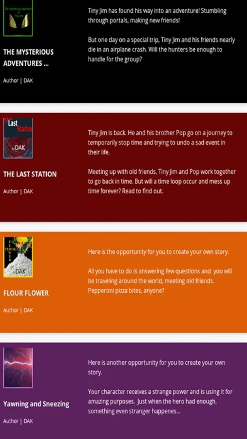 There are four stories to choose from. The Mysterious Adventures of Tiny Jim is about a character who found his way into an adventure! Stumbling through portals, making new friends! But one day on a special trip, he and his friends nearly die in an airplane crash. Will the hunters be enough to handle for the group?