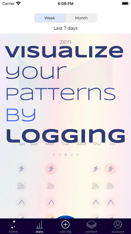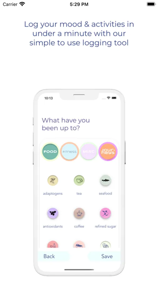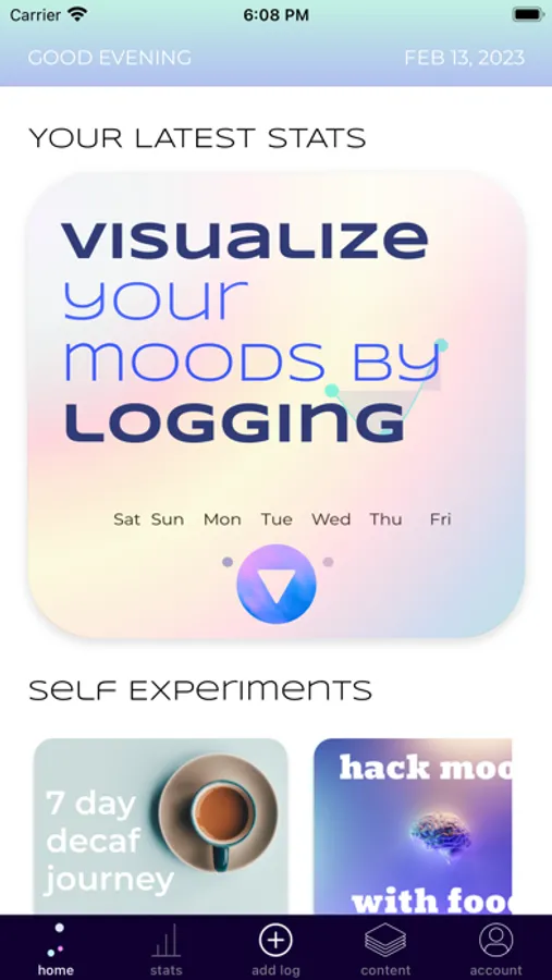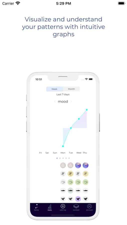In the stats tab you will find your mood graphs - beautifully visualized to track the variations in your emotional and creative landscape. Visualize mood over the past week or a whole month all together. Click on mood data points to see mood details and the food/activity inputs for that day.
