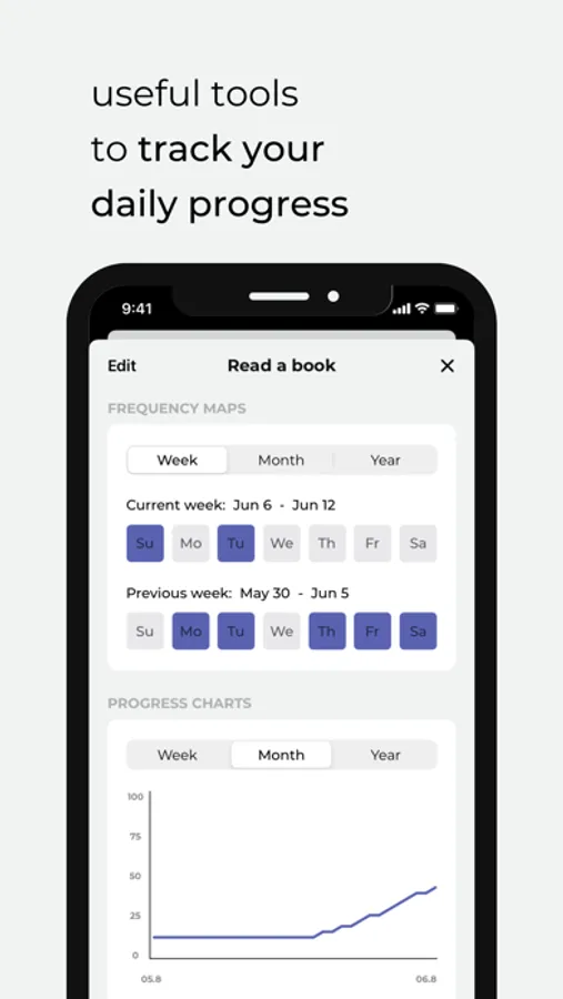 Useful Analytics. Graphs, frequency maps, calendar, and check-in logs are all there to keep track of your progress.