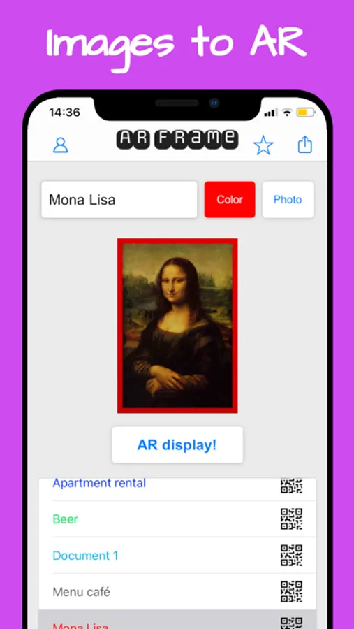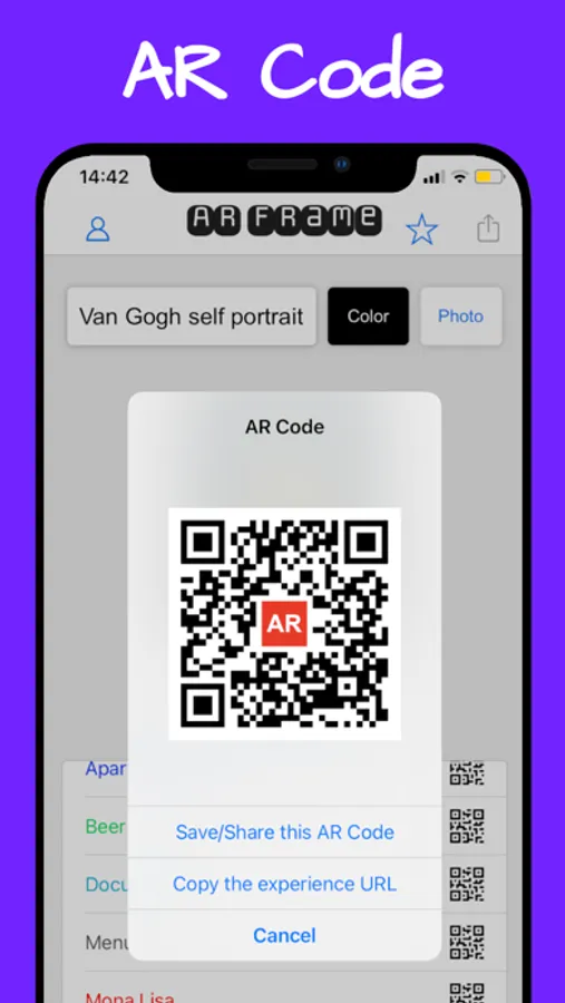 Developed in partnership with the AR Code service, you can within the application generate the Augmented Reality Codes for each of your creations. This code will allow you to easily share your AR Frame creation or anchor them in places of your choice (room, showcase, product, ...).